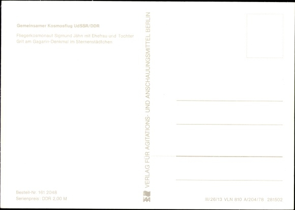 Ak Kosmosflug UdSSR DDR, Sigmund Jähn mit Frau und Tochter, Gagarin Denkmal Swjosdny Gorodok