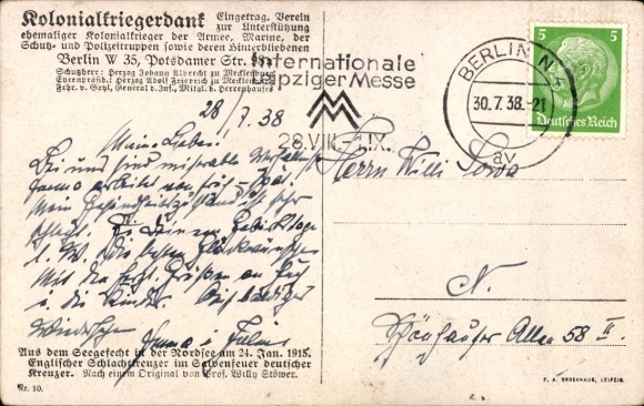 Zustand, siehe Scan, gelaufen, 1938 - ca 14 cm X 9 cm