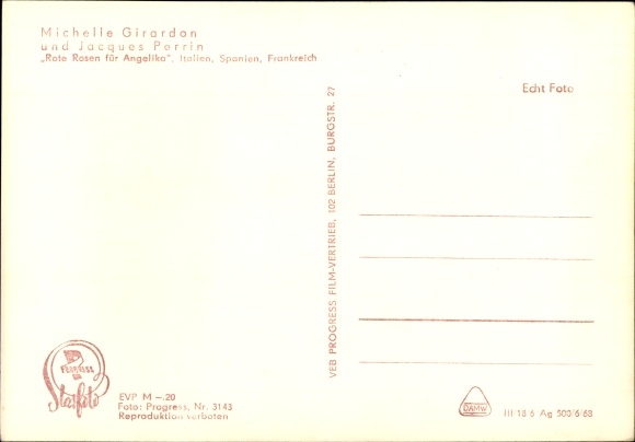 Ak Schauspieler Jacques Perrin und Michelle Girardon, Rote Rosen für Angelika
